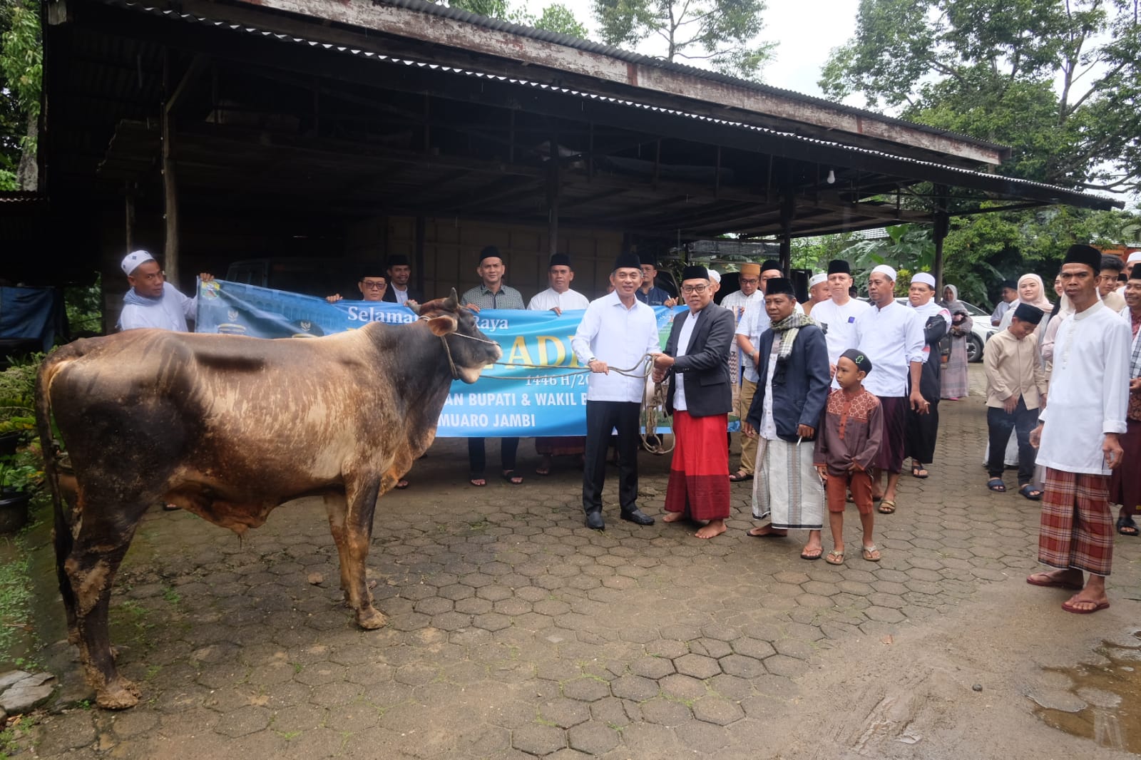 Usai melaksanakan sholat Idul Adha Wabup Junaidi bersama istri menyerahkan hewan qurban kepada Lurah Jambi Kecil Arman Bunadi disaksikan ketua masjid dan pengurus masjid serta masyarakat setempat.